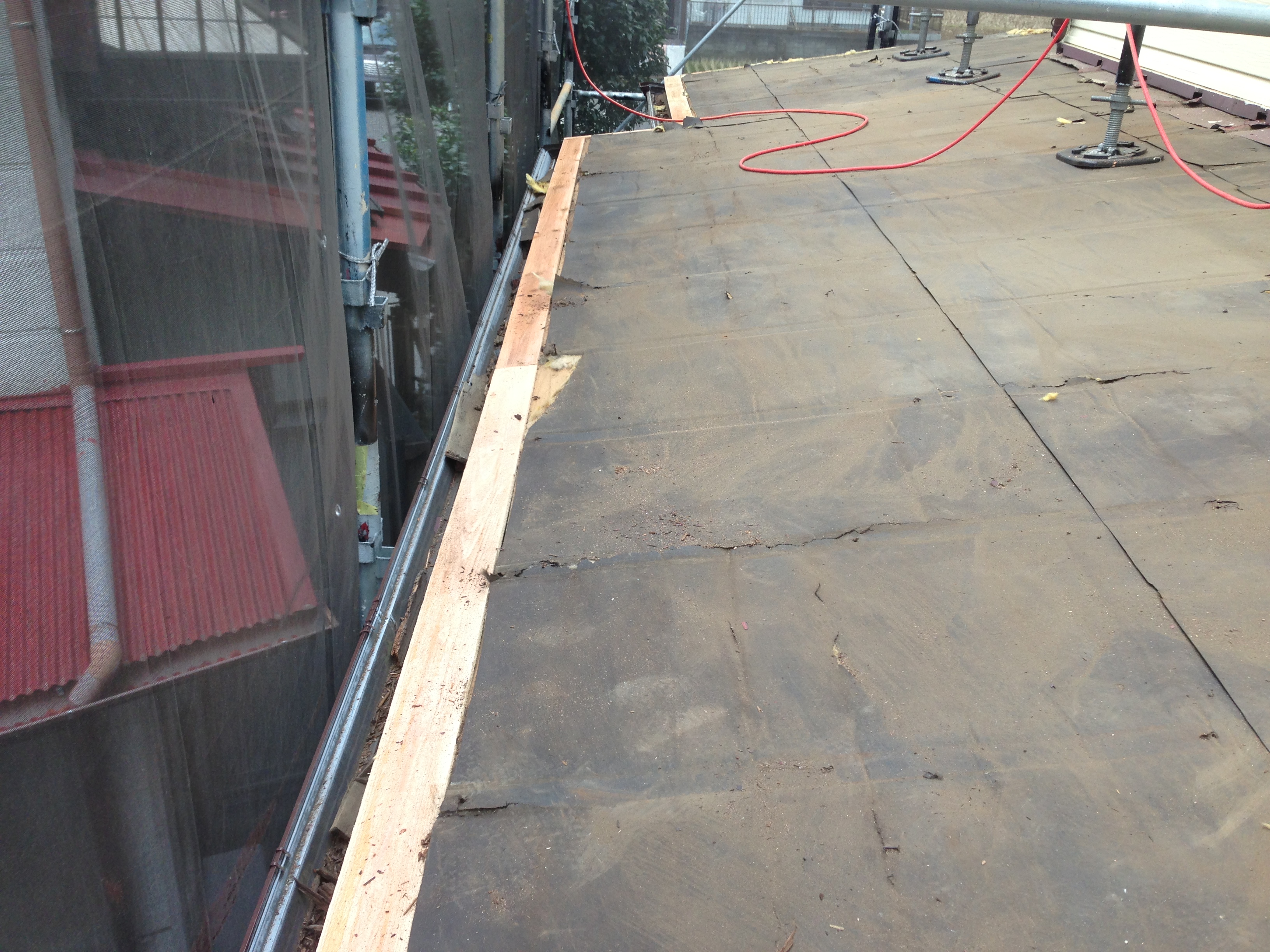 古い屋根材を一枚ずつ剥がしていきます。桟木がかなり腐食しているのがわかります。