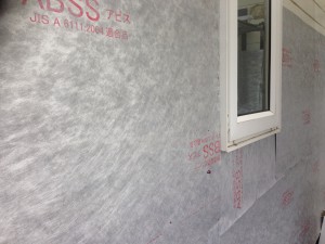 次に外壁です。樹脂サイディングの施工前に外壁にも防水シートを施工します。今回は遮熱性能もプラスされたワンランク上の「ABSS(アビス)」を使用致しました。