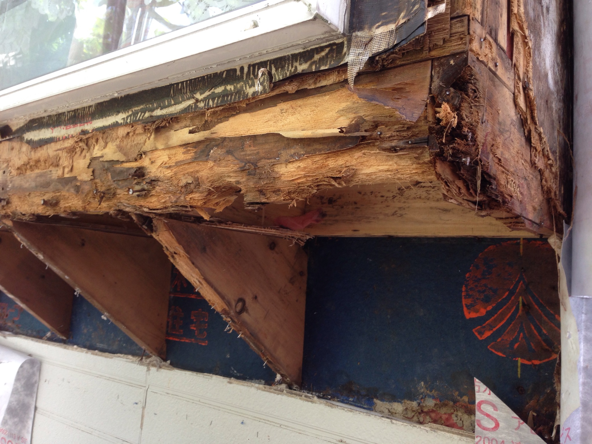 T様の了解を頂き、出窓のサイディングをを剥がしました。やはり雨漏りしていたようで、下地がかなり腐食しておりました。