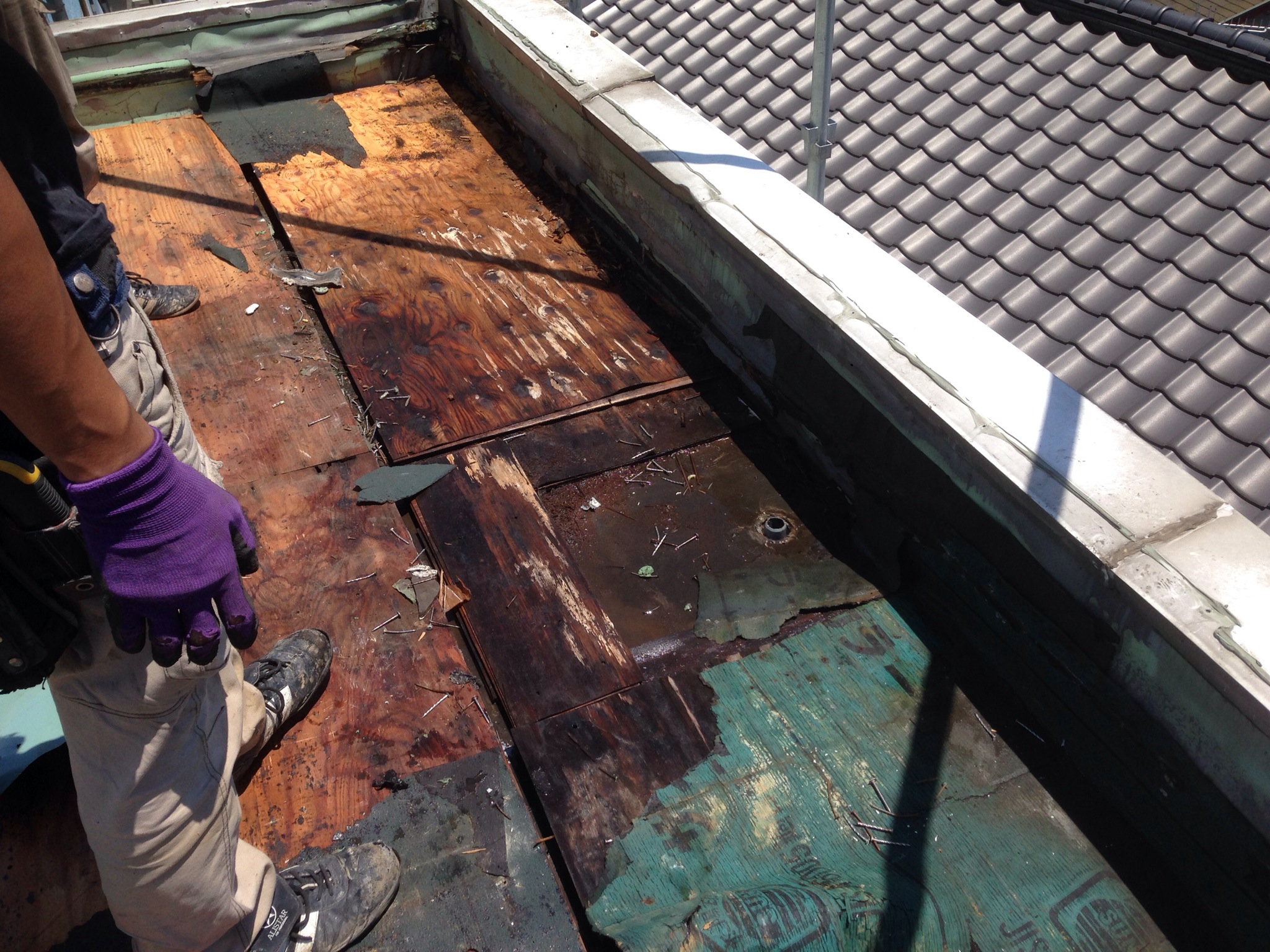 新しい野地板を施工しました。ドブの部分には勾配を設け、水が流れるようにしてあります。